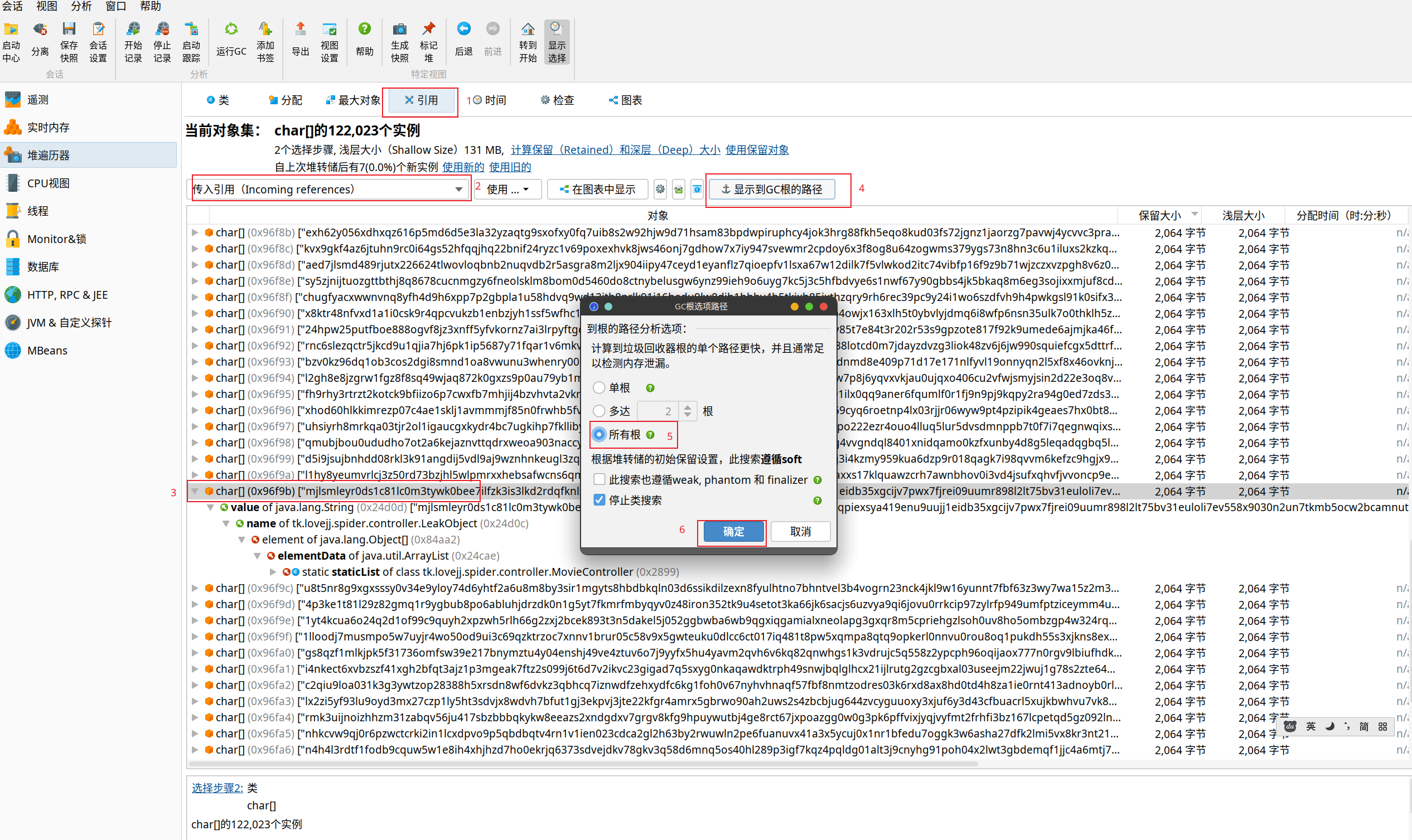 - 选择引用->传入引用-->选择觉得可疑的对象-->显示GC根的内容 可以看到找到了对应的controller